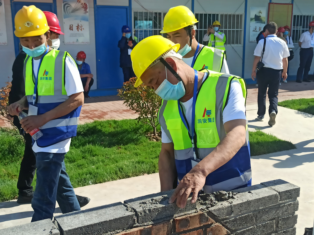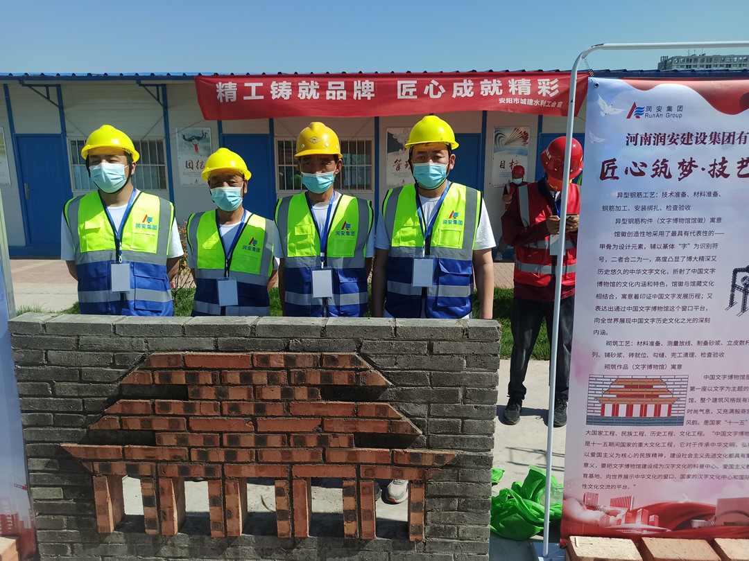本次技能展示活動(dòng)設(shè)置了鋼筋綁扎和砌筑兩個(gè)項(xiàng)目,我公司派遣八名職工代表參加了本次技能展示,選手們身著統(tǒng)一工作服,以嫻熟的操作技能展現(xiàn)了過(guò)硬的技術(shù)水平。砌筑工速度與質(zhì)量并重,一手拿著泥刀,一手不停地一塊塊砌磚,每一道工序、每一個(gè)細(xì)節(jié)都力求做到完美,最終圓滿完成了砌筑作品《文字博物館》。鋼筋工粗中有細(xì),在大面積作業(yè)的同時(shí),即時(shí)進(jìn)行細(xì)節(jié)處理,確保作品垂直、平整,經(jīng)過(guò)一系列的復(fù)雜操作,一個(gè)完美的安陽(yáng)文字博物館館徽便呈現(xiàn)在眼前。高超的技藝水平贏得了領(lǐng)導(dǎo)和現(xiàn)場(chǎng)觀眾的一致稱贊。